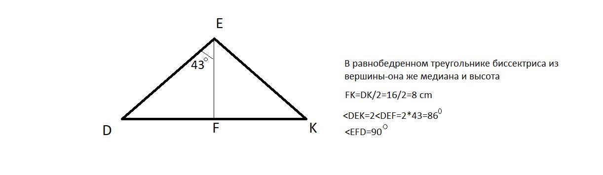 В равнобедеренном треугольнике DEK с основанием DK=16 см отрезок EF - биссектриса, - угол