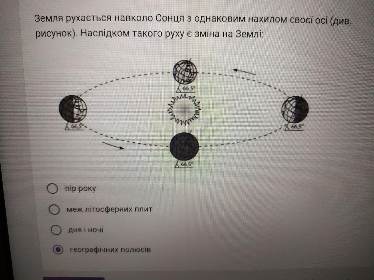 Земля рухається навколо Сонця з однаковим нахилом своєї осі (див. рисунок). Наслідком такого руху є зміна на Землі: