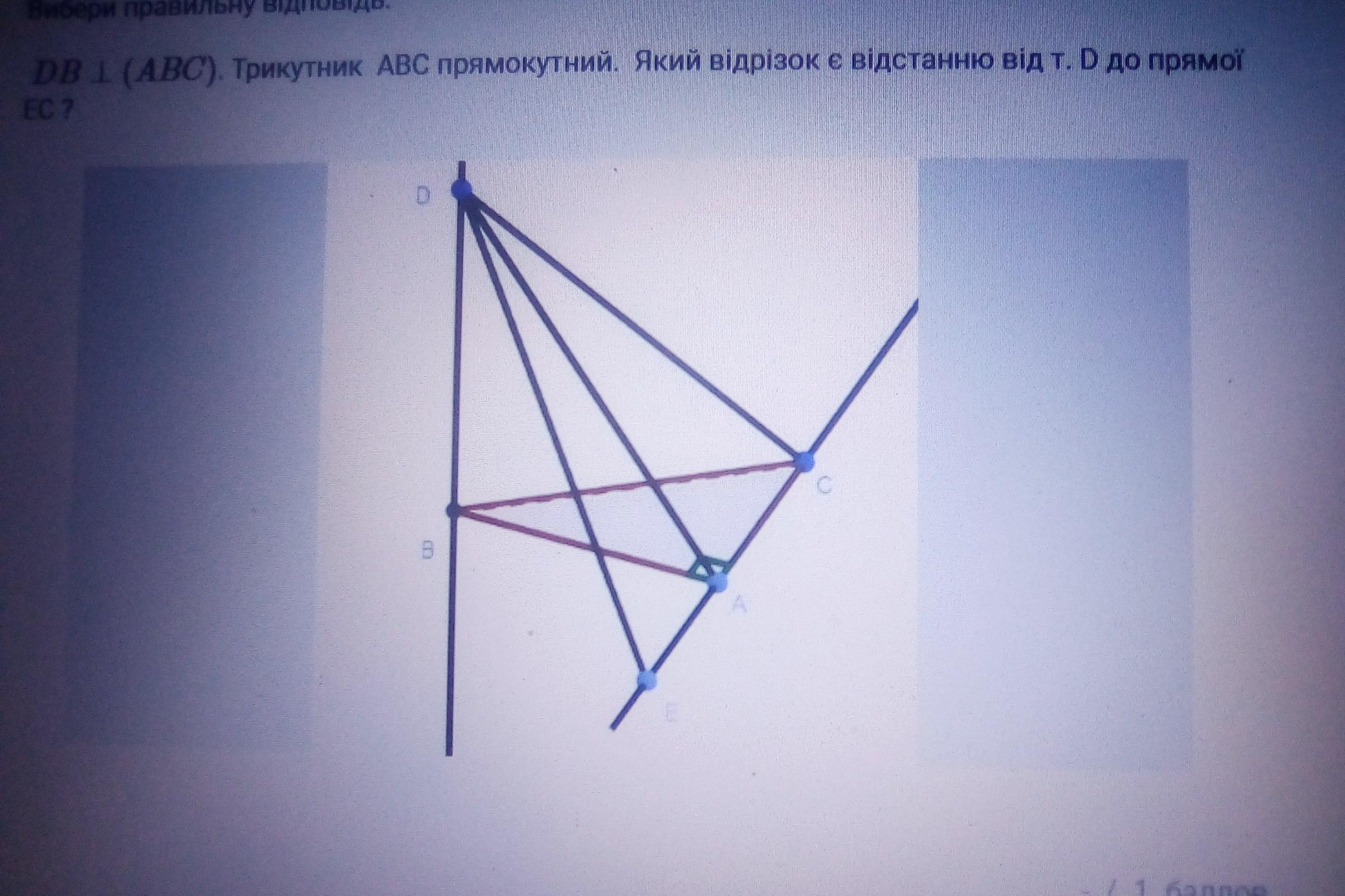 Вибери правильну відповідь. DB I (ABC). Трикутник ABC прямокутний. Який відрізок є вiдстанню від т. D до прямот ЕС ?. Срочно ставлю 50б. Будь-ласка
