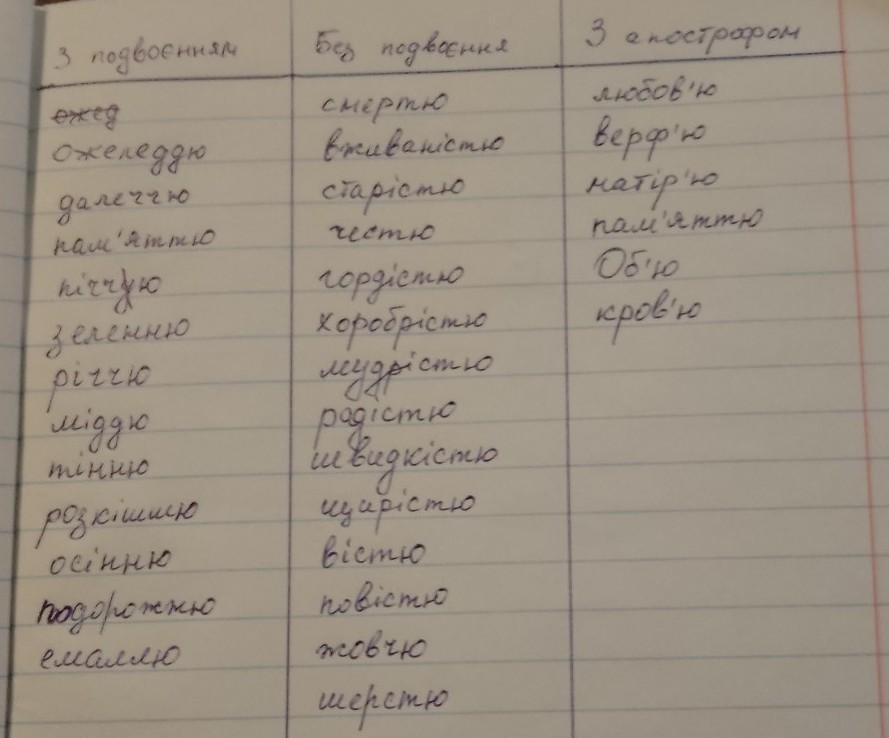 З подвоєнням : ожеледдю, далеччю, пам'яттю,піччю, зеленню, річчю, міддю, тінню, розкішшю, осінню, подорожжю, емаллю.