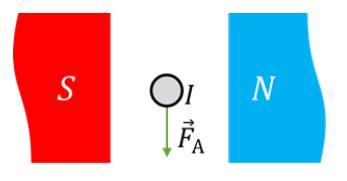 Визначте напрямок струму в провіднику, який перебуває у магнітному полі (див. рисунок).