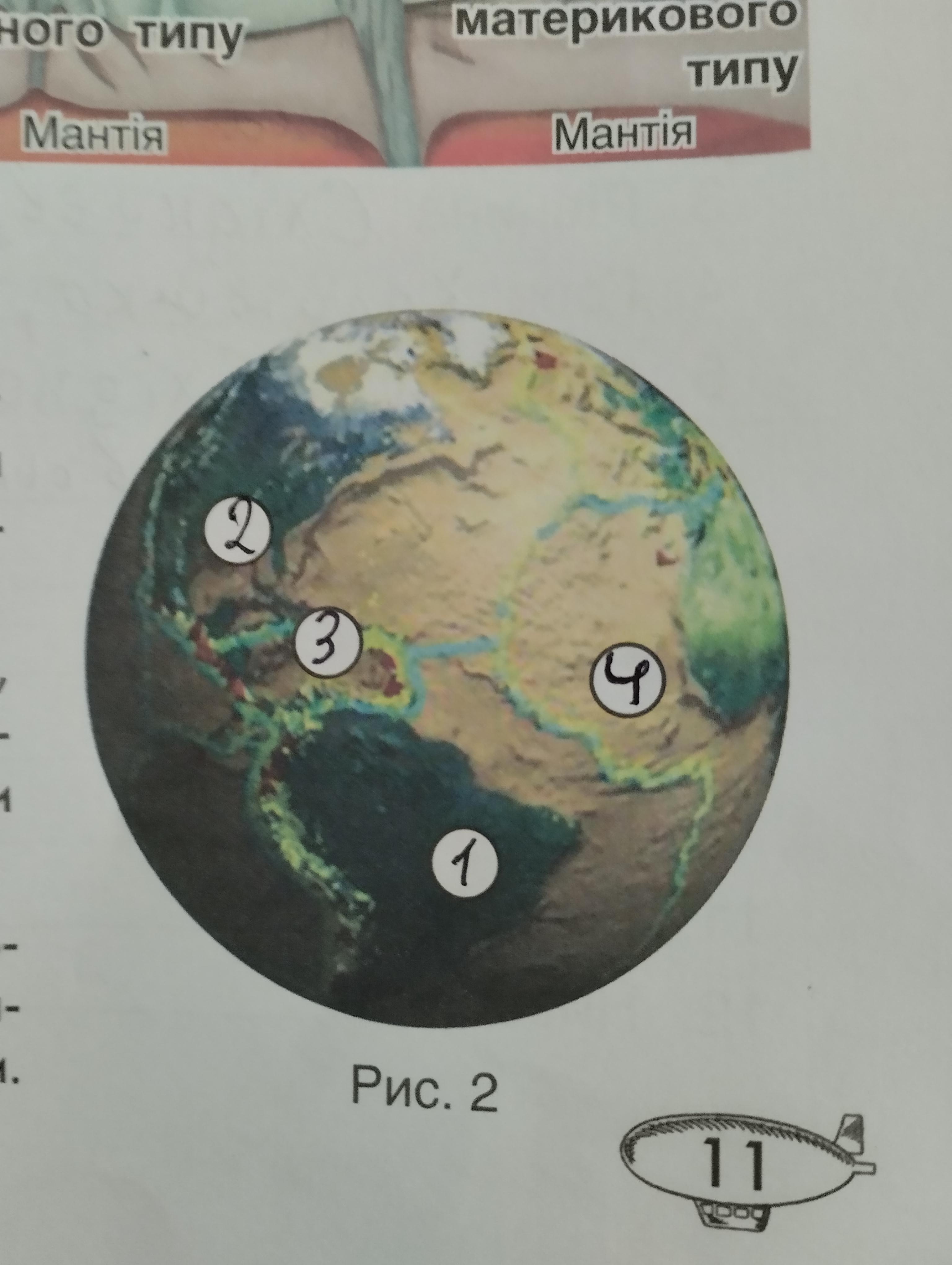 Познач на рис. 2 відповідними цифрами Північноамериканську(1), Південноамериканськ(2), Карибську(3), Африканську (4) літосферні плити.