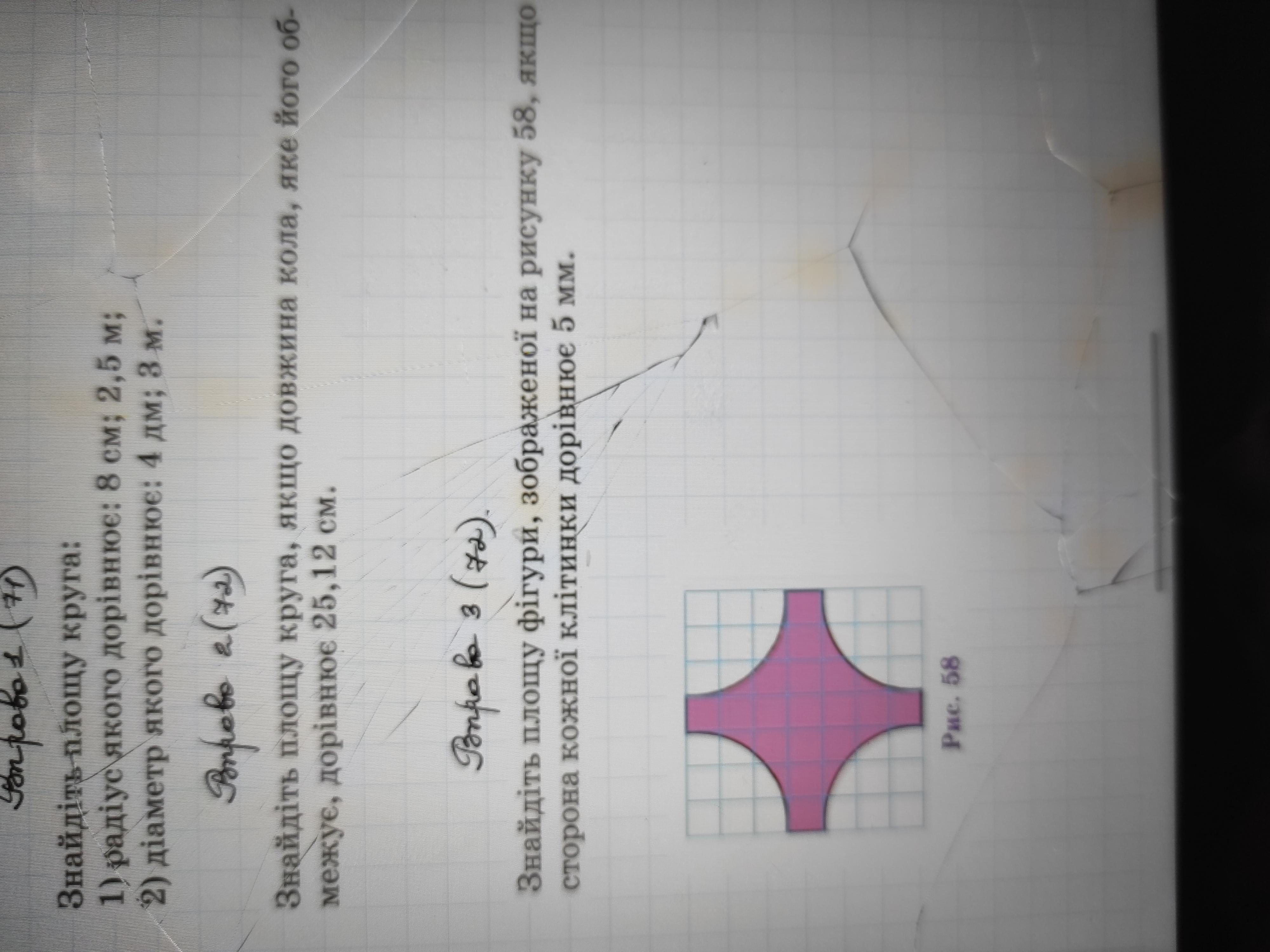 2. r каждой окружности = 1кл*3=0,5*3=1,5 см, но т.к. видно только 1/4 окружности, то площадь нужна только 1 => S=πr²=3,14*1,5²=3,14*2,25=7,065 см² ; S кв=a²=7²=49 см² => S ф=Sкв-Sокр=49-7,065=41,935 см²