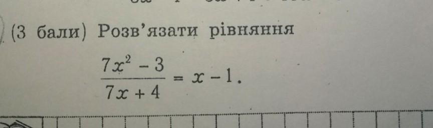 (7x^2-3) / (7x+4) = x-1 -- домножуємо обидві частини рівняння на 7x+4.