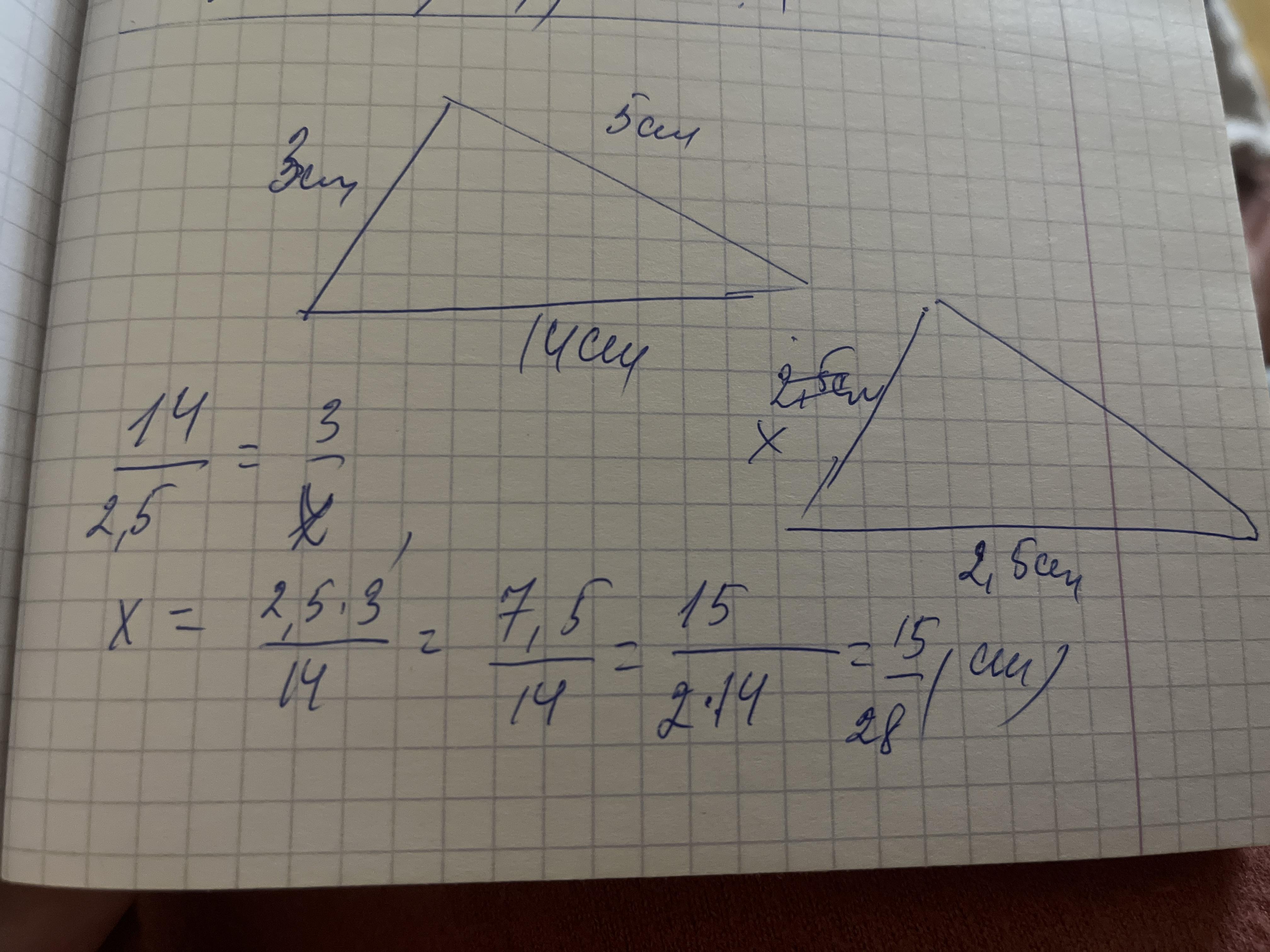 Сторони трикутника дорiвнюють 5 см. 3 см 14 см. Знайдіть найменшу сторону подібного трикутника, якщо його найбiльша сторона = 2,5 см.