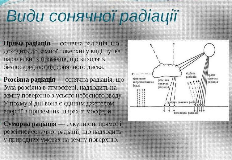 сонячна редіація це кількість тепла та світла, що потрапляють до поверхні Землі Сумарна радіація =пряма+розсіяна