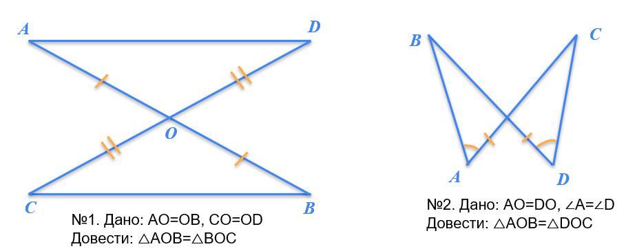1. CO = OD, AO = OB, кутСОВ = кутDOA - перша ознака рівності трикутників