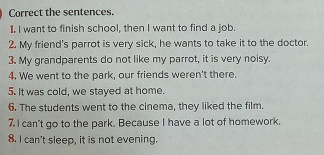 Correct the sentences(исправьте ошибки) 1. I want to finish school, then I want to find a job. 2. My friend's parrot is very sick, he wants to take it to the doctor. 3. My grandparents do not like my parrot, it is very noisy. 4. We went to the park, our friends weren't there. 5. It was cold, we stayed at home. 6. The students went to the cinema, they liked the film. 7. I can't go to the park. Because I have a lot of homework. 8. I can't sleep, it is not evening.