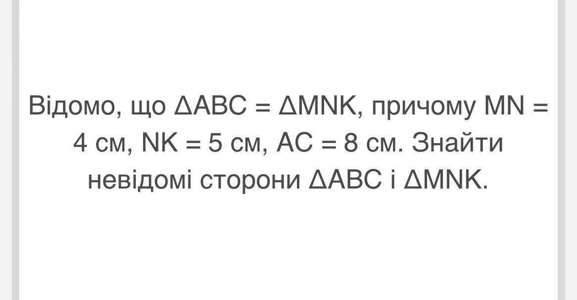 Ответ:якщо трикутники рівнв за 3 ознакою рівностей трикутників то MN=AB AB=4см NK=BC BC=5 см AC=MK MK=8 см