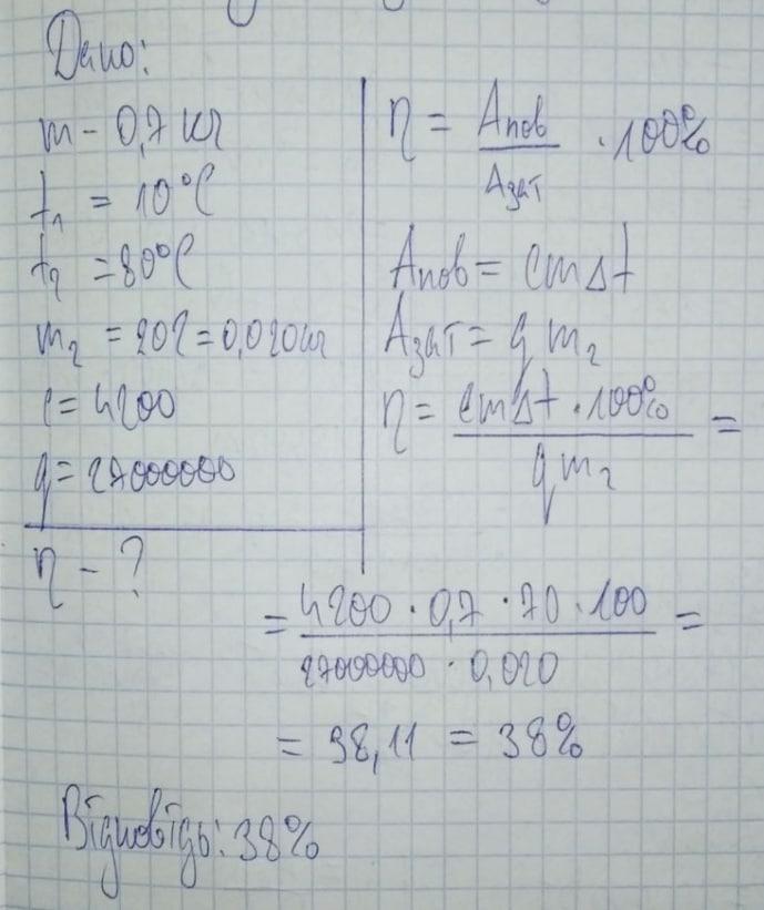 Спиртовий нагрівник нагрів 700 г води від 10°С до 80°С. Визначте ККД нагрiвника, якщо на нагрівання витрачено 20г спирту. Задачу виконати в зошиті