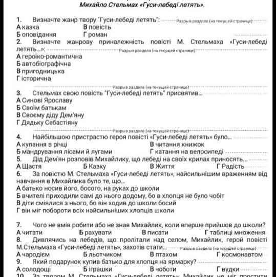 1. Визначте жанр твору "Гуси-лебеді летять": -Разрыв раздела (на текущей странице)
