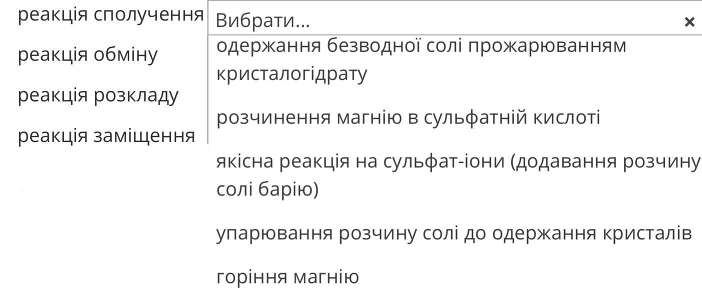 Встановіть відповідність між процесом та типом хімічної реакції, що в ньому відбувається