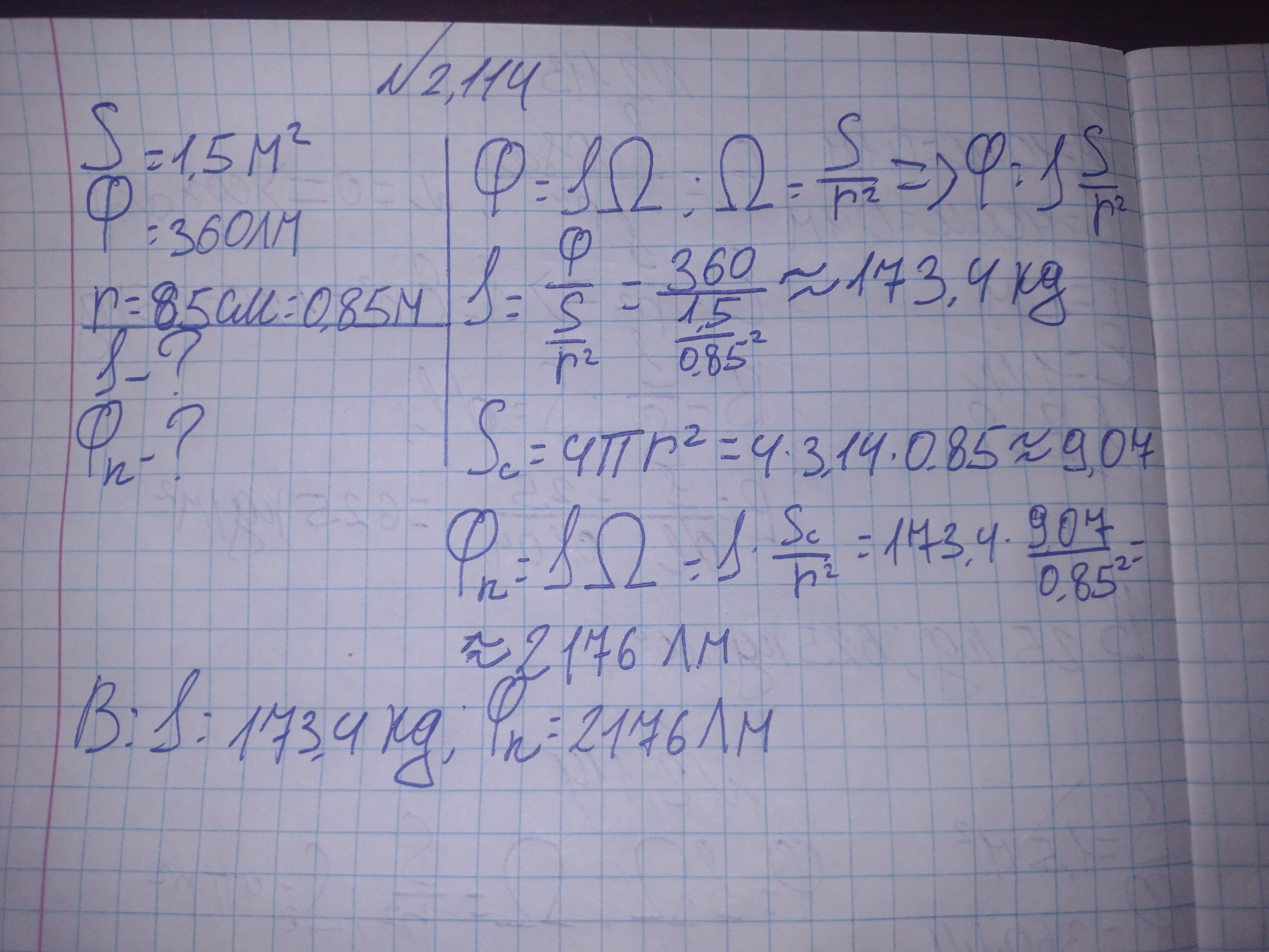 2.114. Визначте силу точкового джерела світла, якщо воно міститься в центрі сфери, радіус якої 85 см, і на поверхню цієї сфери площею 1,5 м випромінює світловий потік 360 лм. Який повний світловий потік, що випромінює це джерело? 011E