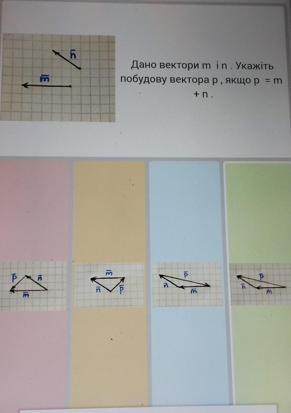 Дано вектори m i n. Укажіть побудову вектора р, якщо p = m+n