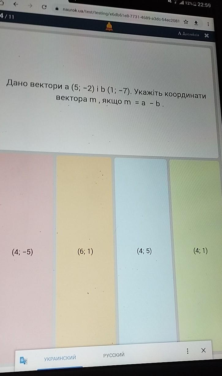 Дано вектори а (5; -2) i ь (1; -7). Укажіть координати вектора м, якщо m = a - b. (4; -5) (6; 1) (4; 5) (4; 1)помогите срочно