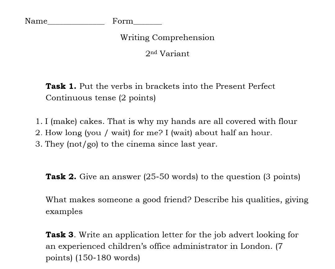 Comprehension 2nd Variant Task 1. Put the verbs in brackets into the Present Perfect Continuous tense ( 2 points ) 1. I ( make ) cakes . That is why my hands are all covered with flour 2. How long ( you / wait ) for me ? I ( wait ) about half an hour . 3. They ( not / go ) to the cinema since last year . Task 2. Give an answer ( 25-50 words ) to the question ( 3 points ) What makes someone a good friend ? Describe his qualities , giving examples Task 3. Write an application letter for the job advert looking for an experienced children's office administrator in London . ( 7 points ) ( 150-180 words )