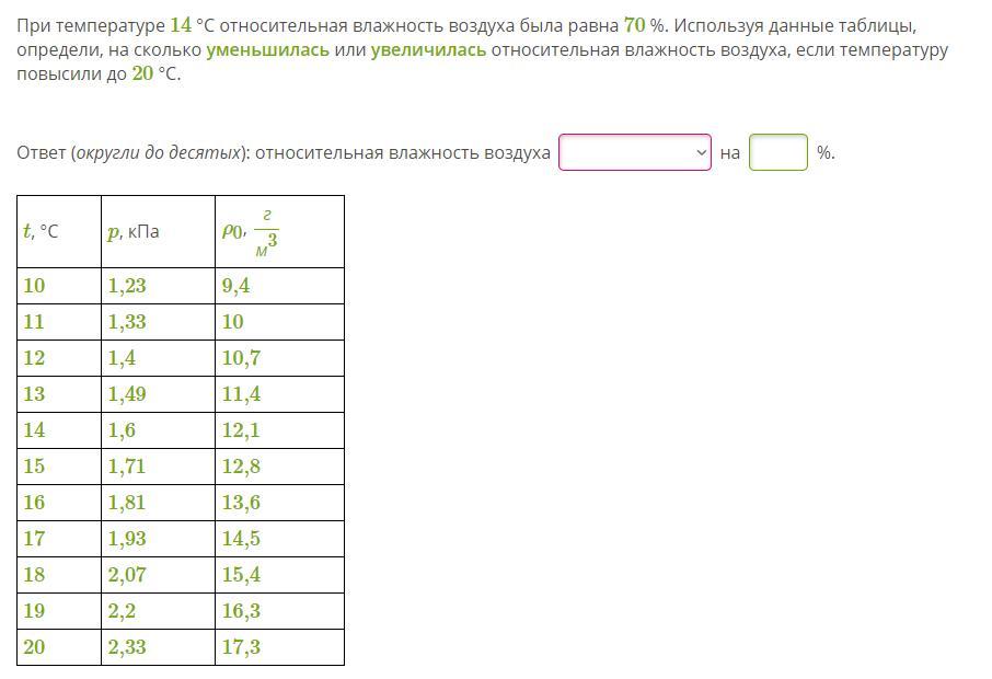φ1=0.7 (70%) p1=1.6 кПа (давление нас. пара при 14°) p2=2,33 кПа (давление нас. пара при 20°) φ2=?