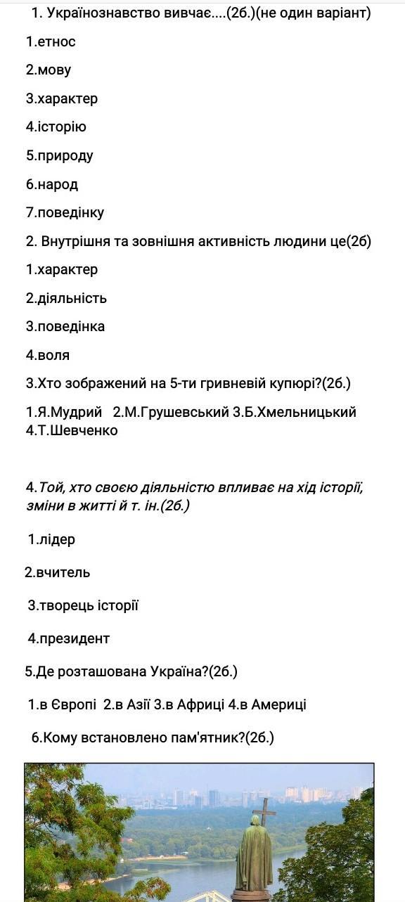 пожалуйста очень срочно даю 30 балов!! 1. Українознавство вивчає....(не один варіант) 1.етнос 2.мову 3.характер 4.історію 5.природу 6.народ 7.поведінку 2. Внутрішня та зовнішня активність людини це- 1.характер 2.дiяльнiсть 3.поведінка 4.воля. 3.Хто зображений на 5-ти гривневİй купюрі? 1.Я.Мудрий 2.М.Грушевський З.Б.Хмельницький 4.Т.Шевченко. 4. Той, хто своєю дiяльнiстю впливає на хід історії, зміни в житті й т. ін.-1.лідер 2.вчитель 3.Творець історії 4.президент 5.Де розташована Україна? 1.в Європі 2.в Азії З.в Африці 4.в Америці 6. Кому встановлено пам'ятник?