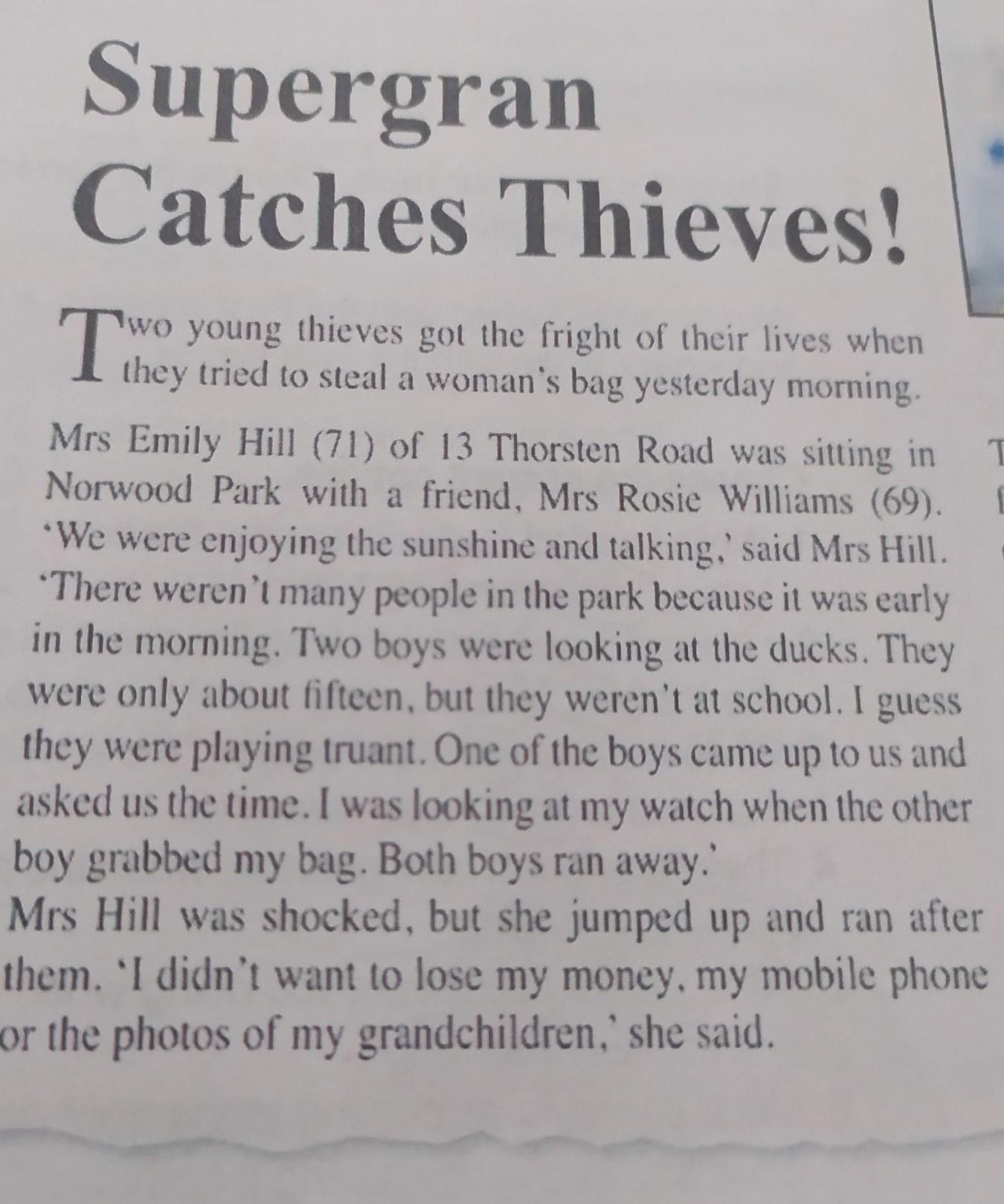 4 2.9 Read the text again. Answer the questions. 1 How old is Mrs Hill? She's 71. 2 What were the boys doing when Mrs Hill first saw them? 3 How did Mrs Hill feel when the boys stole her bag? 4 What was in Mrs Hill's bag? 5 Who caught the boys? 6 What sports does Mrs Hill do?