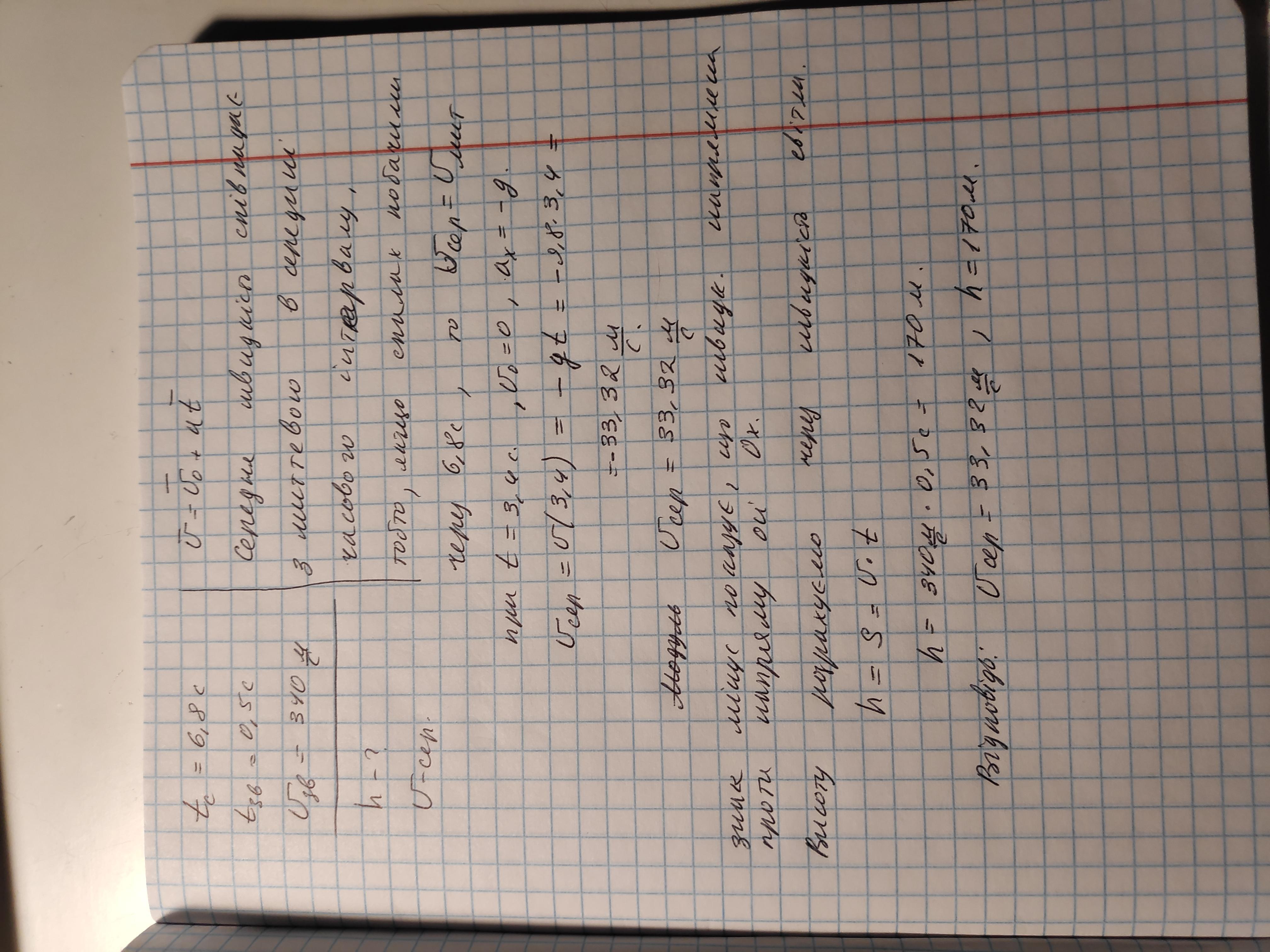 Ракетомоделісти, запустивши вертикально модель ракети, помітили, що вона спалахнула через 6,8 с після старту. Через 0,5 с після спалаху юні конструктори почули звук від вибуху. На яку висоту піднялась і з якою середньою швидкістю рухалась модель ракети? Швидкість звуку у повітрі 340м/с