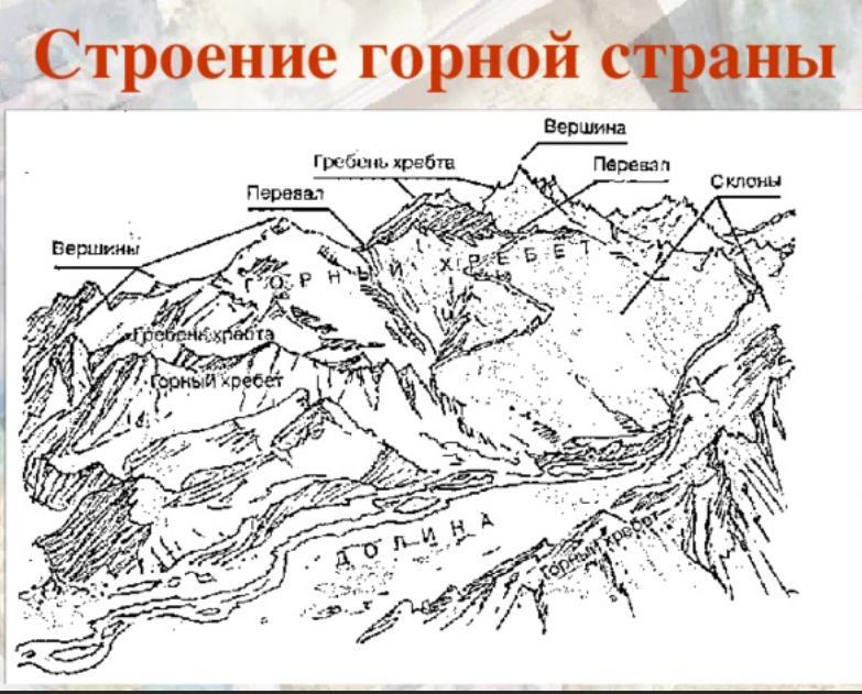 Гірська країна складається з вершини, перевалу, гребеня, схилу.