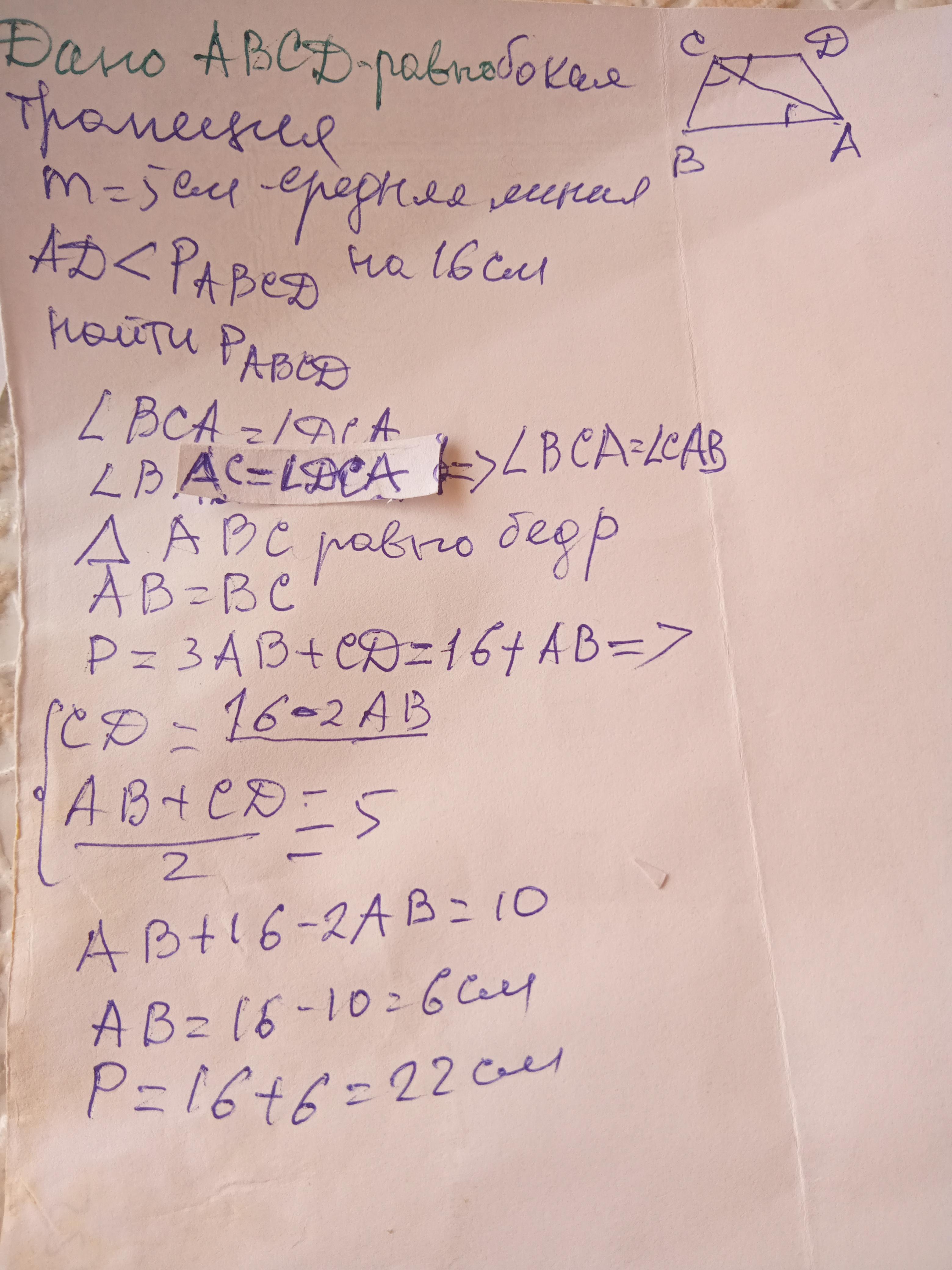 В равнобокой трапеции средняя линия равна 5см, а большее основание на 16см меньше его периметра. Найдите периметр трапеции, если её диагональ делит тупой угол пополам.