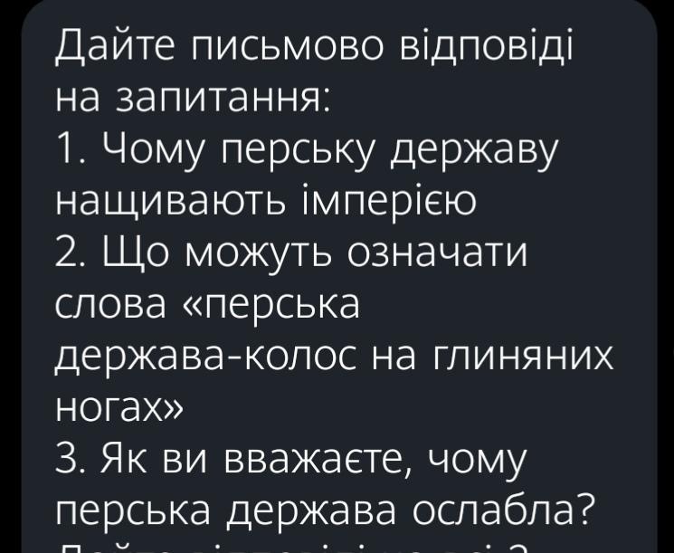 1. Перську державу називали Імперією тому що вона мала багато підкорених земель. 2. Всі імперії без виключення є колосами на глиняних ногах, бо велетенські території цих держав утворені шляхом насилля над народами, і за умови послаблення центральної влади така держава швидко розпадається на окремі володіння. 3. Згодом величезна Перська імперія ослабла через повстання підкорених народів, виснаження від воєн і в 331 р. до н. е. була завойована видатним полководцем Александром Македонським.
