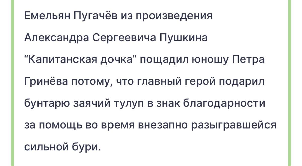 Ответ: 1 Когда во время казни Савельич бросился в ноги к Пугачёву, атаман сразу узнал "старого хрыча" и понял, что казнить должны человека, который так хорошо отблагодарил его за услугу, поэтому Пугачёв помиловал Гринёва в 2 Пётр Гринёв, подарив "проходимцу" в благодарность за услугу заячий тулупчик, не только спас этим свою жизнь, но и обрёл настоящего друга в лице предводителя крестьянского восстания. Сам Пугачёв по натуре скорее добр. Ценя не только доблесть, но и честносить Петра Гринёва, Пугачёв и в дальнеёшем оказывает ему необходимую поиощь: способствует освобождению Маши Мироновой из рук предателя Швабрина, обеспечивает иолодым людям безостановочный проезд, "приказав выдать ... пропуск во все заставы и крепости, подвластные ему".