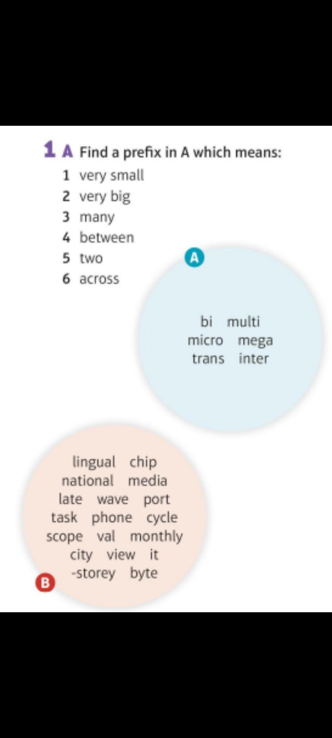 1 very small- micro 2 very big- mega 3 many-multi 4 between-trans 5 two-bi 6 across-inter