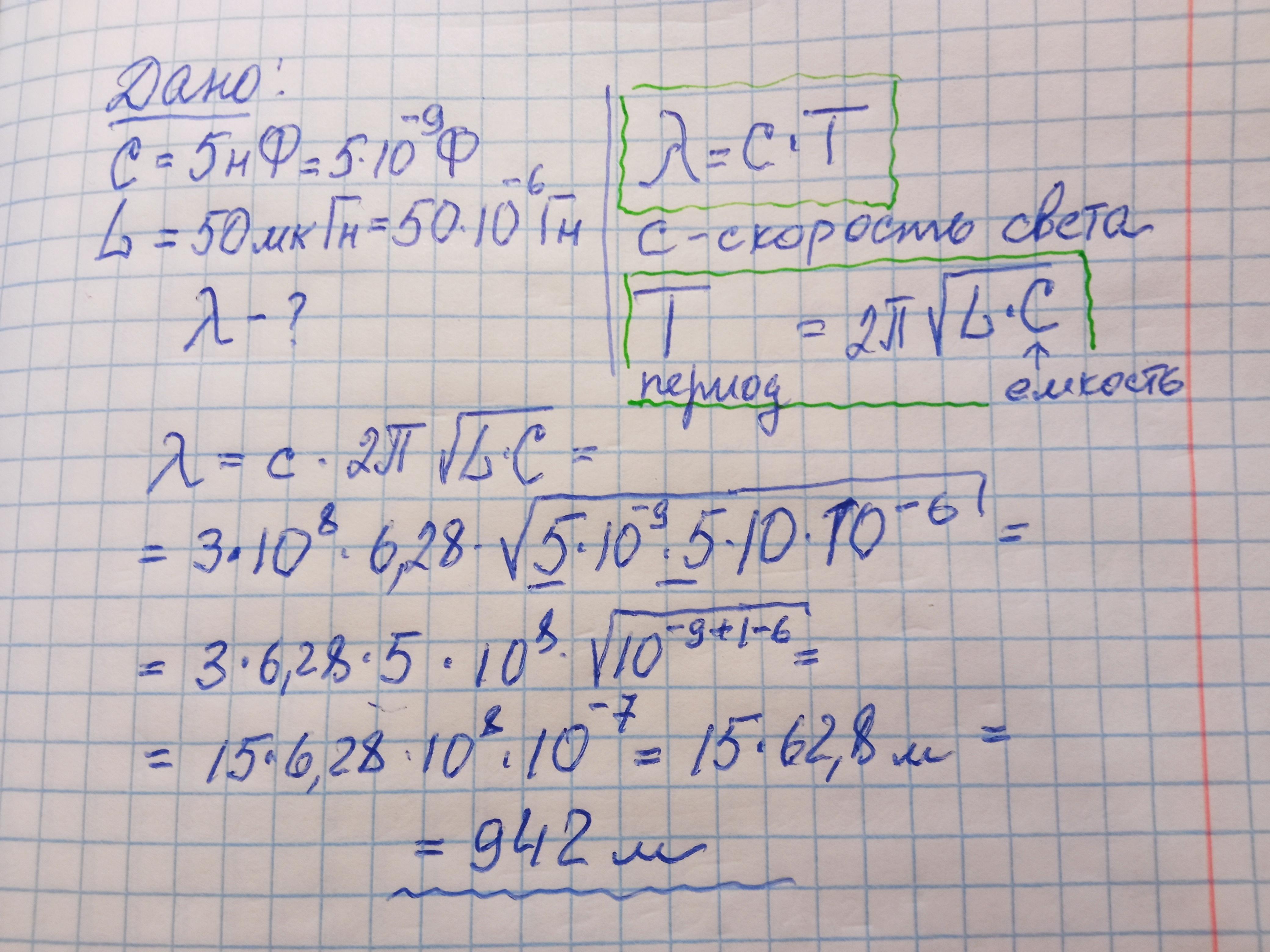 Найдите в метрах длину волны, на которую настроен колебательный контур, если его емкость 5 нФ, а индуктивность 50 мкГн.