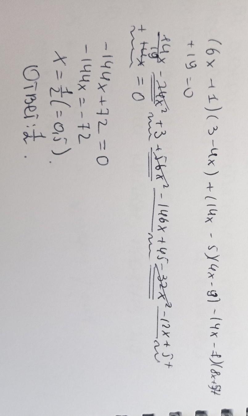 (6x + 1)(3 – 4x) + (14x - 5)(4x - 9) - (4x - 1)(8x + 5) + 19 =0. СРОЧНО ПОМОГИТЕ ДАЮ 50 балов