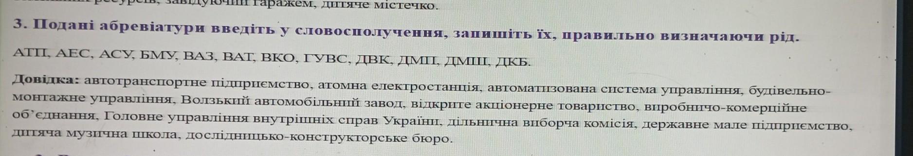 АТП- Автотранспортне підприємство, АЕС- Атомна електростанція, АСУ- Автоматизована система управління, БМУ-Будівельно-монтажне управління, ВАЗ-Волзький автомобільний завод, ВАТ- відкрите акціонерне товариство, ВКО- виробничо-комерційне обладнання, ГУВС- Головне управління внутрішніх справ України, ДВК- дільнична виборча комісія, ЖМП- державне мале підприємство, ДМШ- дитяча музична школа, ДКБ- дослідницько-конструкторське бюро.