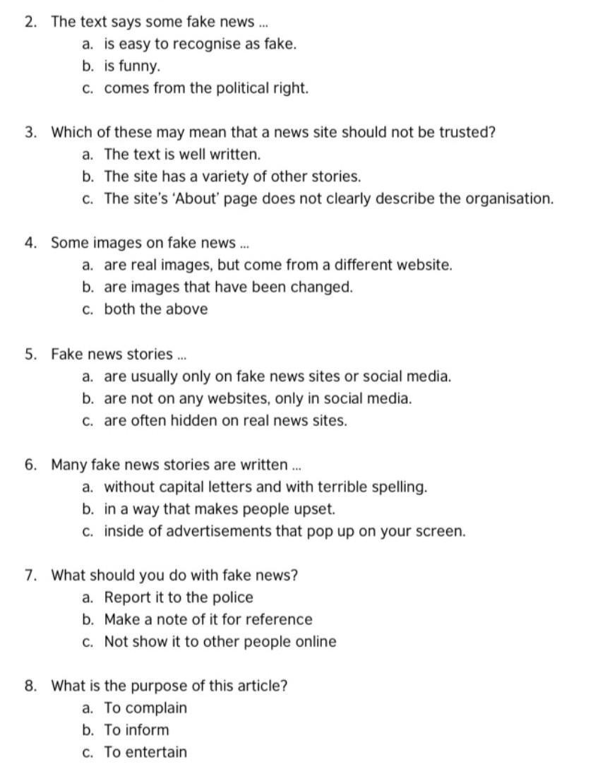 Every time you're online, you are bombarded by pictures, articles, links and videos trying to tell their story. Unfortunately, not all of these stories are true. Sometimes they want you to click on another story or advertisement at their own site, other times they want to upset people for political reasons. These days it's so easy to share information. These stories circulate quickly, and the result is... fake news. There is a range of fake news: from crazy stories which people easily recognise to more subtle types of misinformation. Experts in media studies and online psychology have been examining the fake news phenomenon. Read these tips, and don't get fooled!
