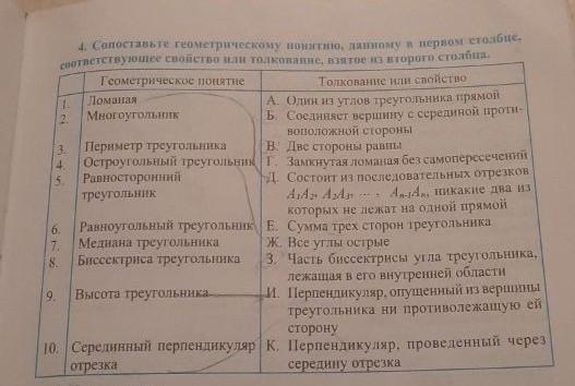4. Сопоставьте геометрическому понятию, данному в первом столбце, соответствующее свойство или толкование, взятое из второго столбца.
