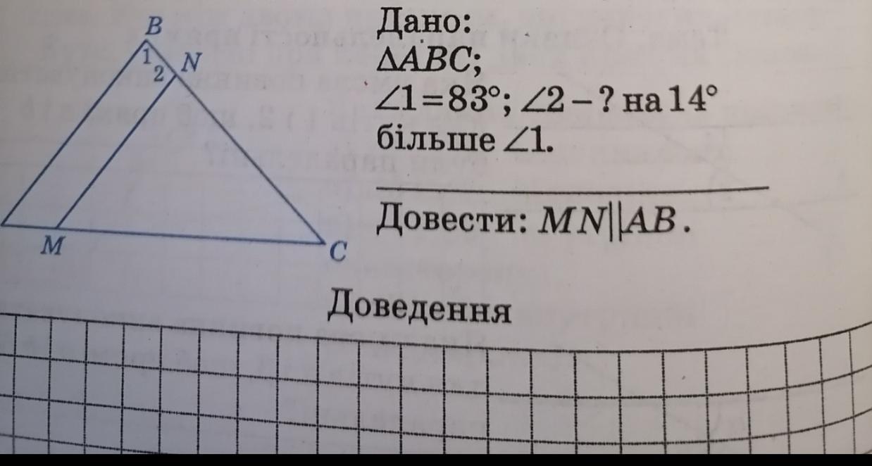 Ответ: ∠2 = 83+14 = 97°. ∠1+∠2 = 83+97 = 180°. Звідси MN∥AB, а BN січна, бо сума внутр. односторонніх кутів дорівнює 180°, що й вимагалось довести