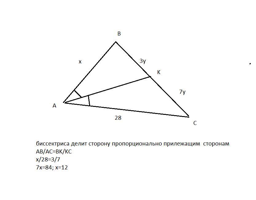Відрізок АК- бісектриса трикутника АВС. Знайдіть сторону АВ, якщо ВК: КС = 3 : 7, АС = 28 см;