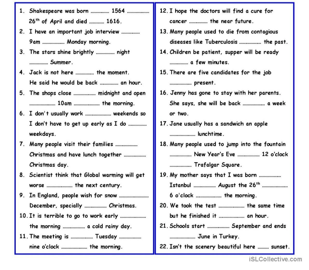 1. Shakespeare was born 26th of April and died 2. I have an important job interview 9am Monday morning. 3. The stars shine brightly. Summer. 4. Jack is not here He said he would be back 5. The shops close 10am worse ........... *********** the morning........... 11. The meeting is nine o'clock 1564 1616. 6. I don't usually work.... I don't have to get up early as I do weekdays. 7. Many people visit their families Christmas and have lunch together Christmas day. 8. Scientist think that Global warming will get the next century. 9. In England, people wish for snow December, specially. 10. It is terrible to go to work early the moment. night an hour. midnight and open the morning. ............ weekends so *********** **********....... Christmas. a cold rainy day. Tuesday the morning. 12. I hope the doctors will find a cure for the near future. cancer **************** 13. Many people used to die from contagious diseases like Tuberculosis the past. 14. Children be patient, supper will be ready a few minutes. 15. There are five candidates for the job present. 16. Jenny has gone to stay with her parents. She says, she will be back ......... a week or two. ********************** 17. Jane usually has a sandwich an apple lunchtime. 18. Many people used to jump into the fountain New Year's Eve 12 o'clock Trafalgar Square. 19. My mother says that I was born Istanbul 6 o'clock August the 26th the morning. 20. We took the test but he finished it ........... ................. 21. Schools start the same time an hour. September and ends June in Turkey. 22. Isn't the scenery beautiful here sunset. iSLCollective.com