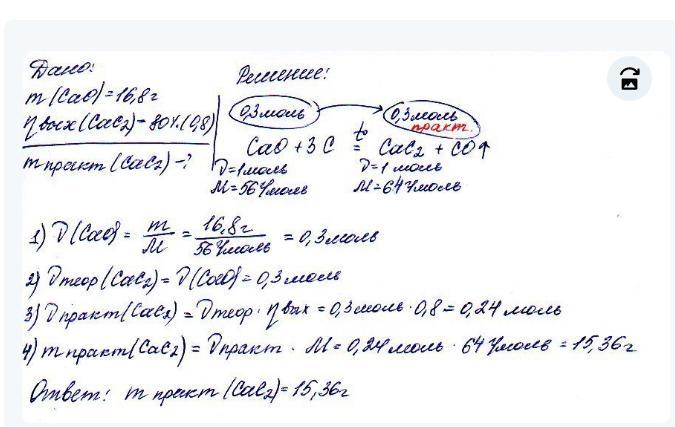mпрак. (CaC₂) = η(CaC₂) * m(теор.CaC₂) = 0,8 * 19,2 = 15,36 г