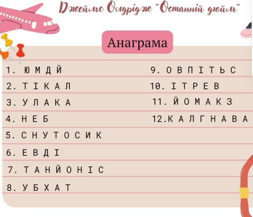 Джеймс Олдрідж "Останій Дюйм" 1. ЮМДЙ 2. ТІКАЛ 3. УЛАКА 4. НЕБ 5. СНУТОСИК 6. ЕВДІ 7. ТАНЙОНIC 8. УБХАТ 9. ОВПІТЬС 10. ІТРЕВ 11. ЙОМАКЗ 12.КАЛГНАВА. СРОЧНООООО ДАЮ 50БАЛОВ