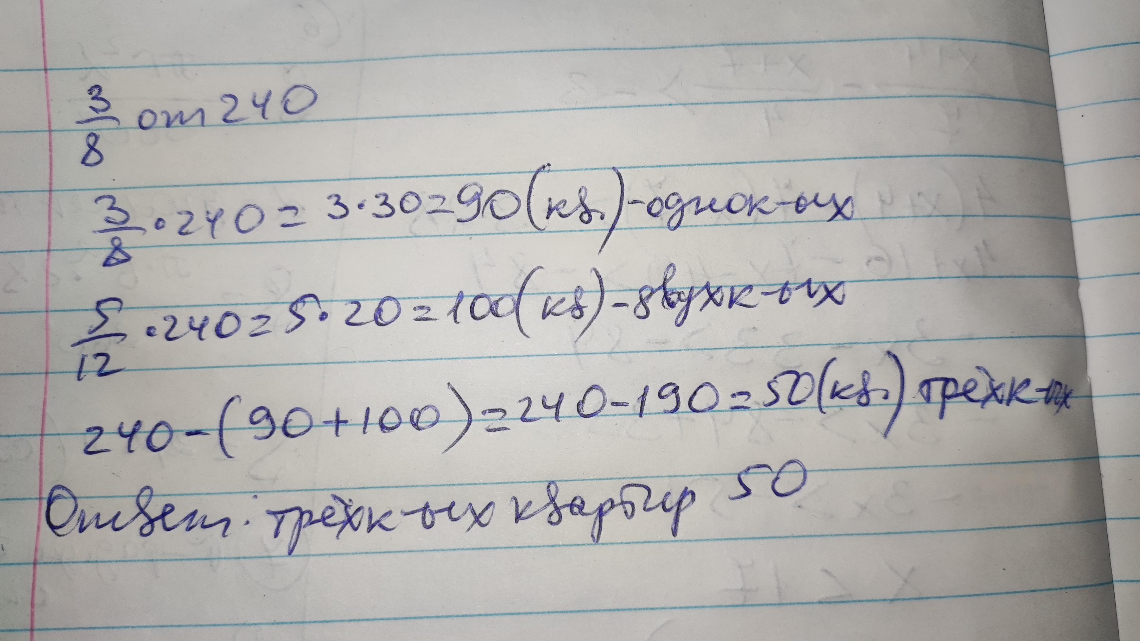 У будинку 240 квартир. Онокімнатні становлять ³/⁸,а двокімнатні -⁵/¹² всіх квартир. Решта трикімнатні. Скільки трикімнатних квартир у будинку?