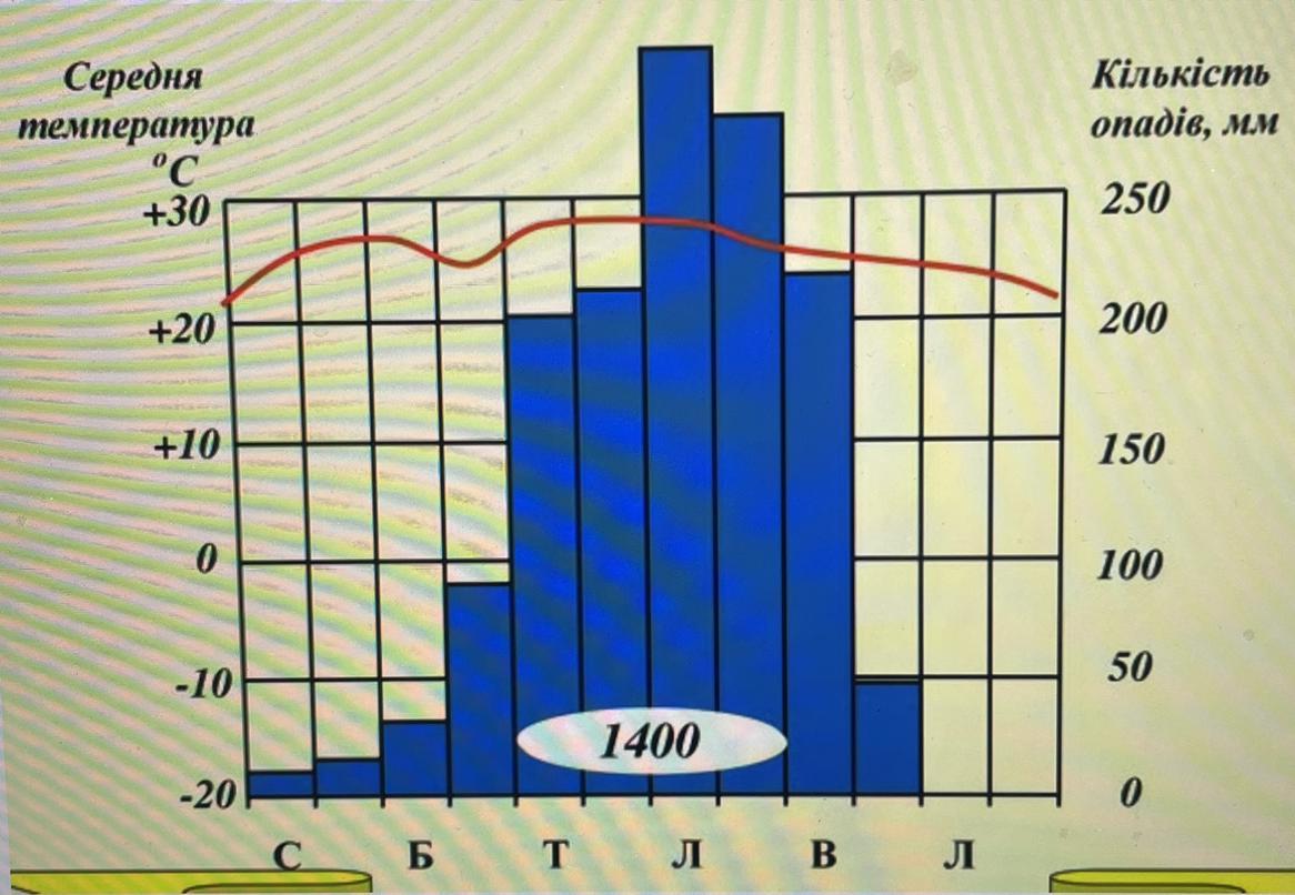 Опишіть клімат за кліматичної діаграмою 1) Визначте тип клімату 2) Опишіть основні кліматичні показники 3) Укажіть райони Африки та південної Америки для яких буде характерне даний типо клімату