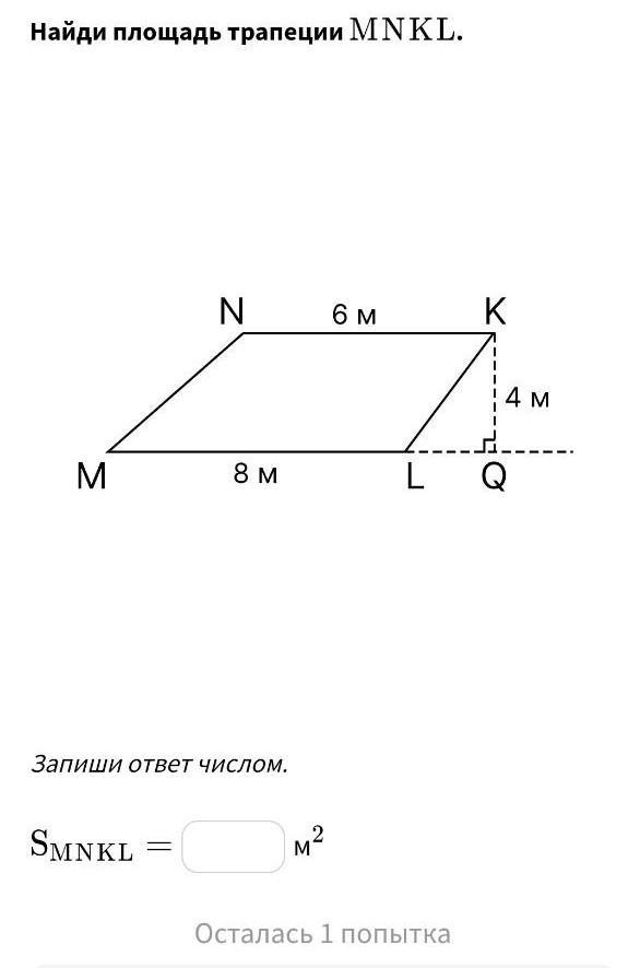 Упражнение 3 из 7 Найди площадь трапеции MNKL. M SMNKL Запиши ответ числом. = N 6 M 8 м Сообщить об ошибке M L K 4 м Q помогите пж