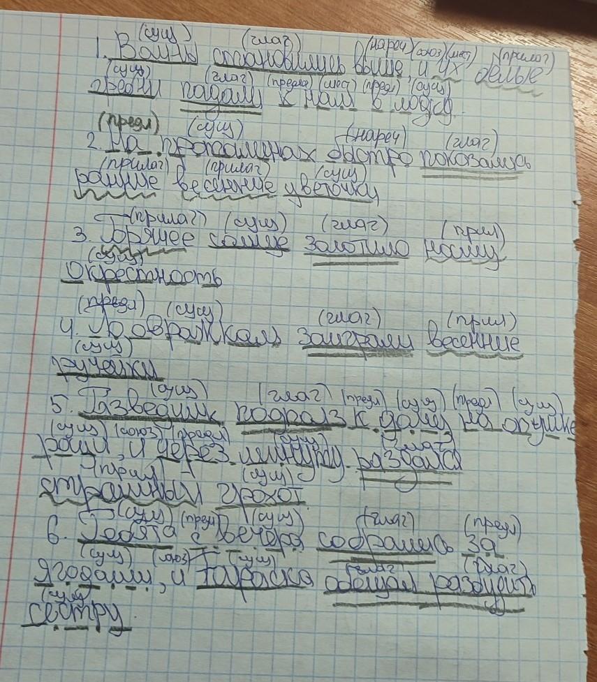 Подчеркнуть каждое слово как член предложения, подписать части речи.1 Волны становились выше, и их белые гребни падали к нам в лодку.