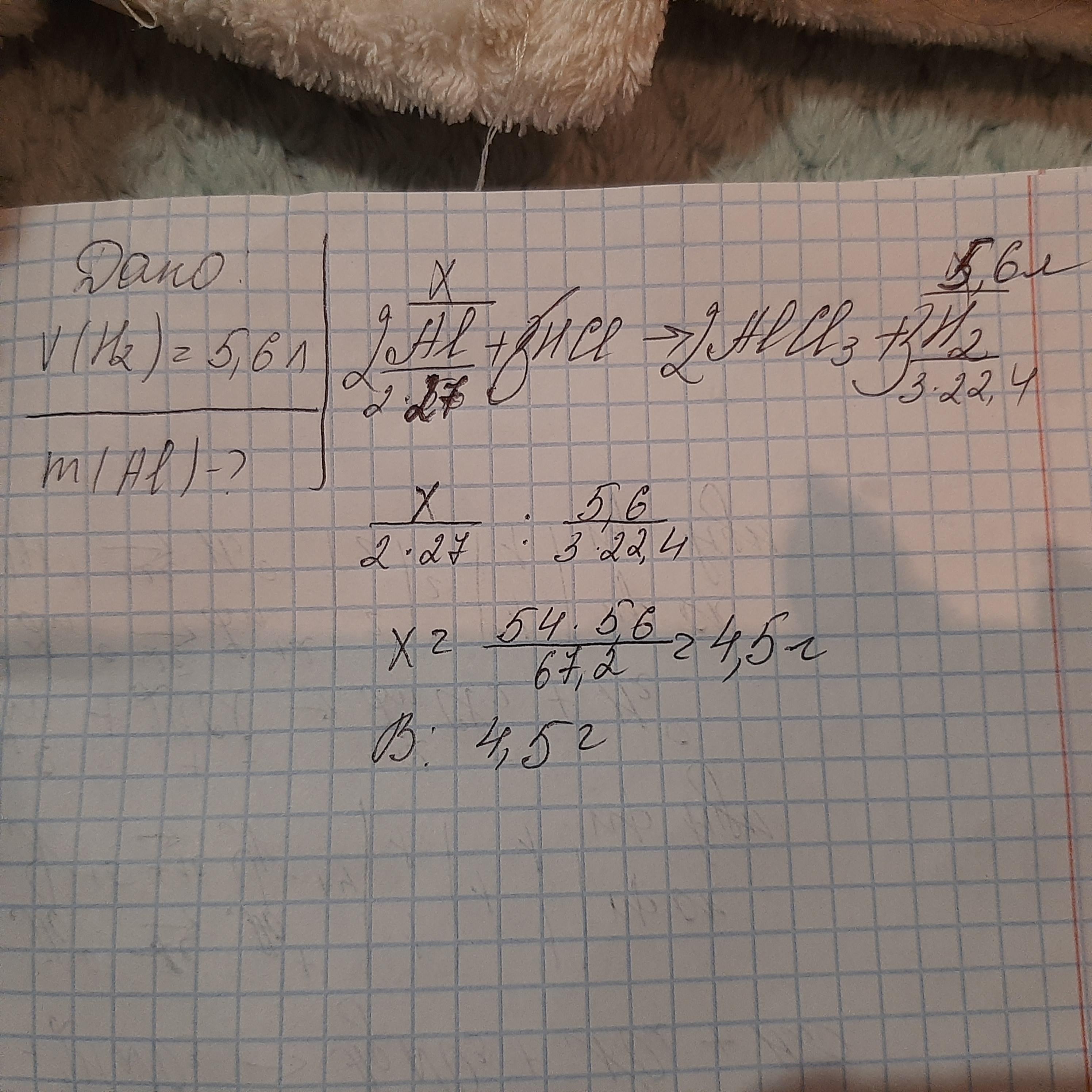 Обчисліть масу алюмінію, яку необхідно взяти для реакції з надлишком хлоридної кислоти, щоб утворилось 5,6л водню