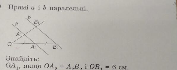 Тк прямые а и в параллельный, то они делят стороны угла на равные отрезки, значит ОА1=ОВ1:2=3см