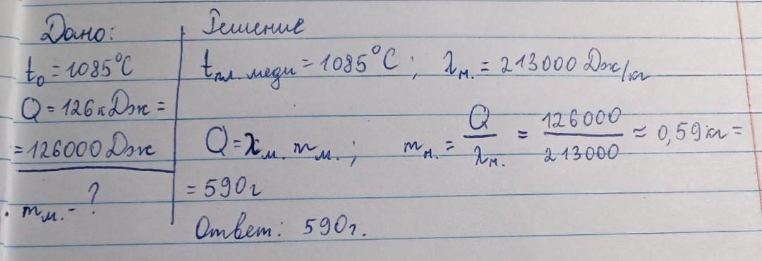 Скільки міді, що має температуру 1085 0 С, можна розплавити, передавши їй 126 кДж теплоти?