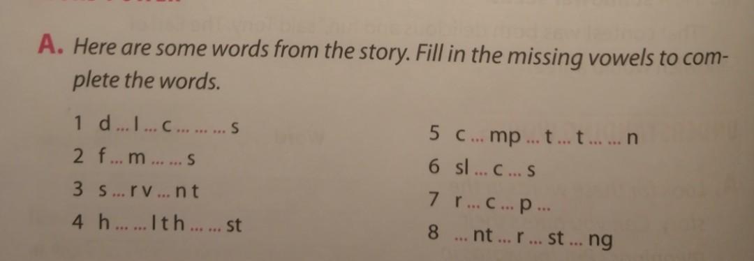 Here are some words from the story. Fill in the missing vowels to com- plete the words.