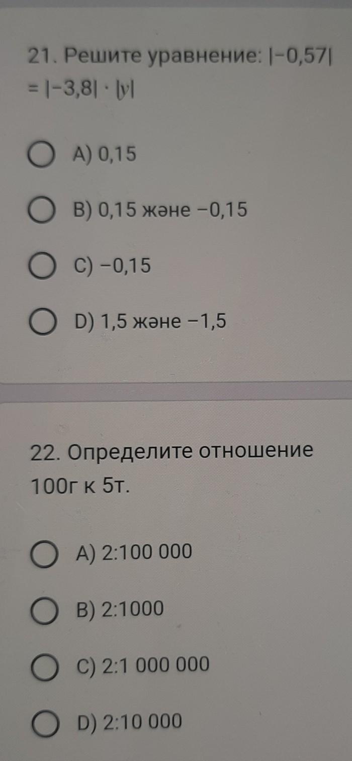 21. Решите уравнение: |-0,57| 1 point = 1-3,81 · [yl О A) 0,15 О В) 0,15 және −0,15 О C) –0,15 О D) 1,5 және −1,5 22. Определите отношение 100г к 5т. О A) 2:100 000 О B) 2:1000 0 c) 2:1 000 000 о D) 2:10 000 1 point
