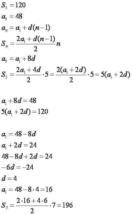 сумма первых пяти членов арифметической прогрессии равна 120, а девятый ее член равен 48. найдите сумму первых семи членов
