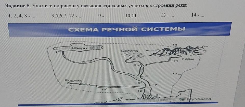 Задание 5. Укажите по рисунку названия отдельных участков в строенни реки. 13 --- 10,11- 3,5,6,7, 12 - 1, 2,4,8 СХЕМА РЕЧНОЙ СИСТЕМЫ